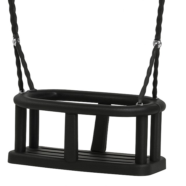 Levereras med rostfri kedja med plastöverdrag och D-schackel för enkel montering på standard gungställningar. Den rundade formen och flexibla stöden ger barnet en trygg och stabil sittposition.